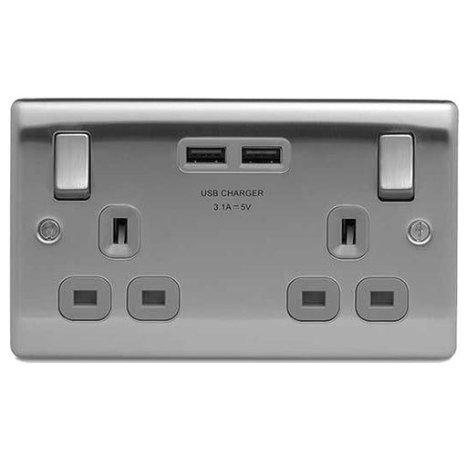BG Nexus Metal Brushed Steel Single Socket with USB Ports NBS21U2G Grey Inserts 13 Amp