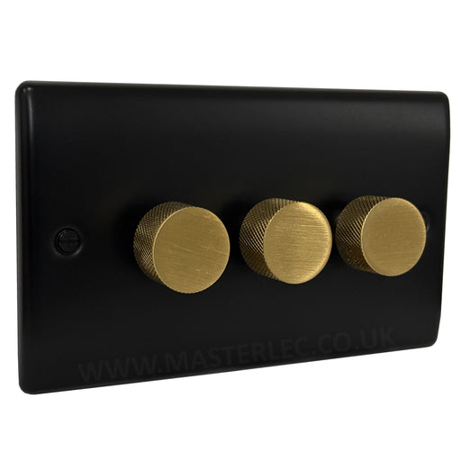 Matt Black 3 Gang Knurled Dimmer Switch with Satin Brass / Antique Gold Dimmer Knob