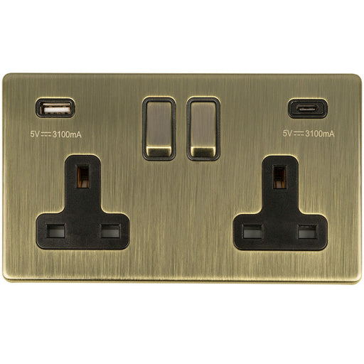 Antique Brass Screwless Switched USB A & C Double Socket Flat Concealed Plate CAB22UACB