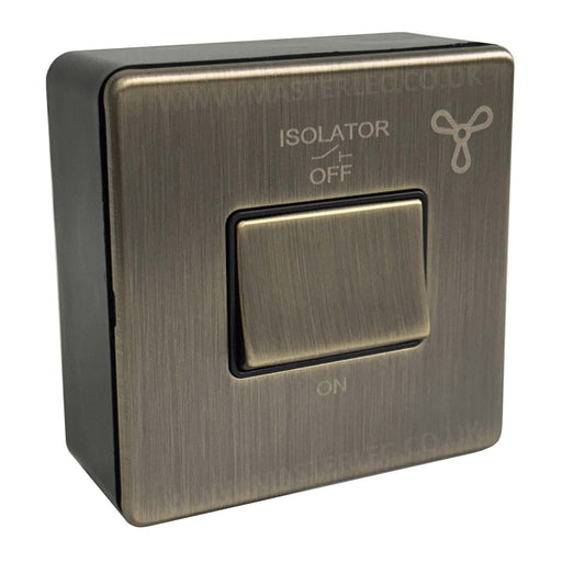 Antique Brass Screwless Fan Isolator Switch & 32mm Black Surface Pattress Back Box