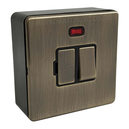 Antique Brass Screwless Switched Fused Spur with Neon & 32mm Black Surface Pattress Back Box